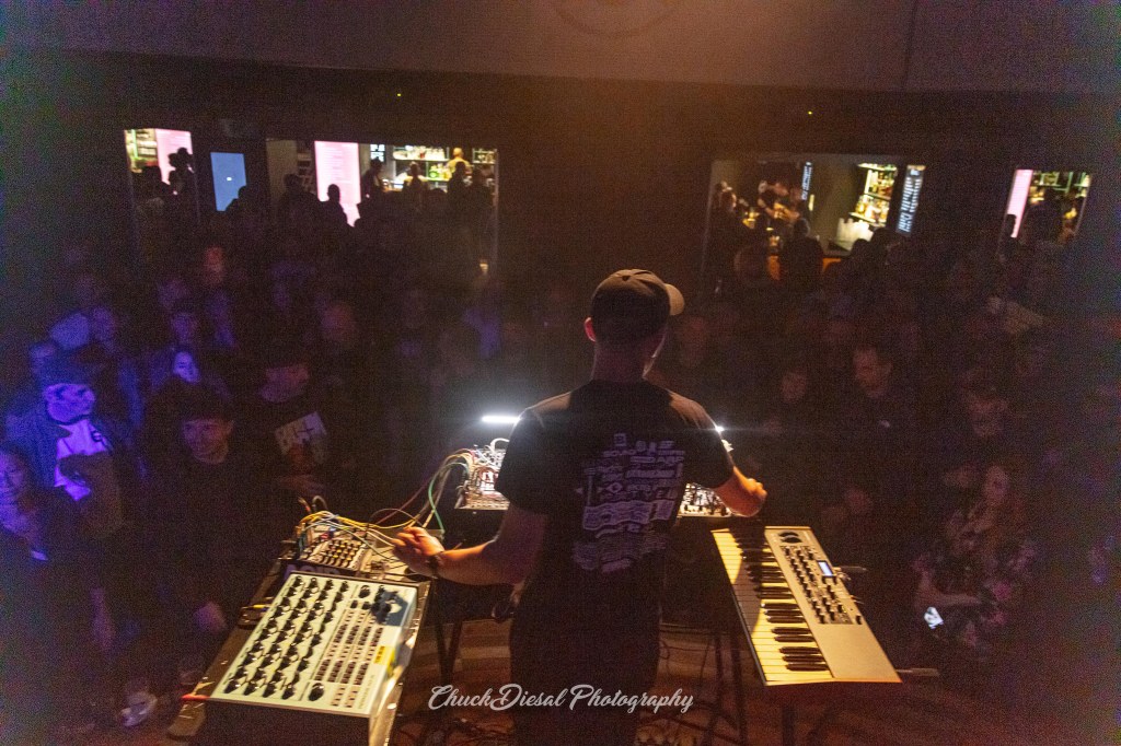 The night at Lucerna Music Bar was pure alchemy. Czech electronic innovator HRTL opened the evening with an analog-heavy performance that blurred the line between science and sound. Surrounded by wires, knobs, and patch cables, he looked like a mad scientist at work & with each twist and connection producing a hypnotic pulse. His set wasn’t just music; it was a visual and sonic experiment in live electronic creation.